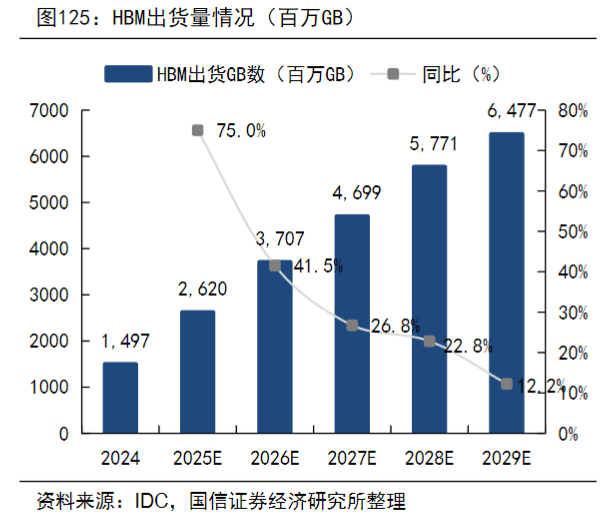 从全球出货量来看,2024年全球HBM出货量为14.97亿GB,预计2029年将达到64.77亿GB,对应2024-2029年的年均复合增速约为30%-40%。