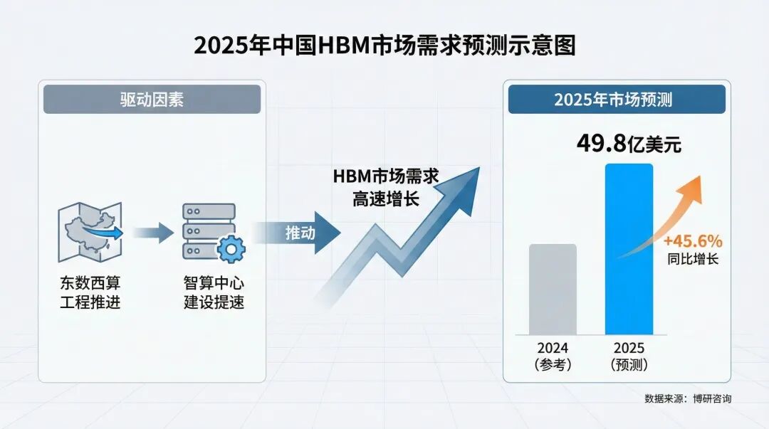 根据博研咨询的数据,随着中国东数西算工程推进和各地智算中心建设提速,预计2025年中国HBM市场需求将继续保持高速增长,市场规模有望达到49.8亿美元,同比增长45.6%。
