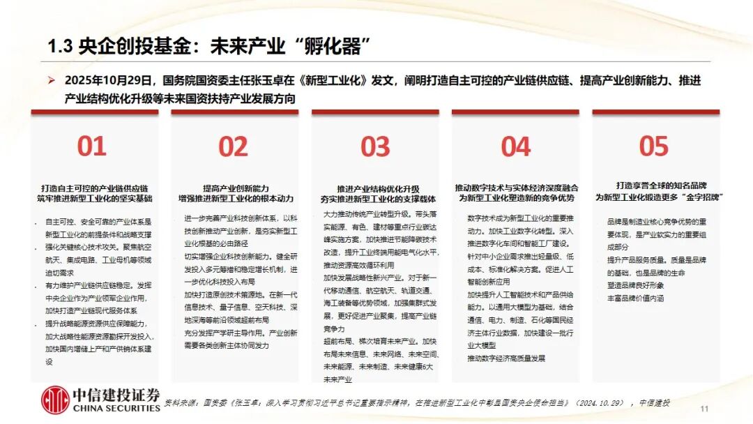 在“十五五”规划开局和“新质生产力”发展要求下,央企的“十五五”战略布局正以前所未有的力度向战略性新兴产业和未来产业集中。央企创投基金已从早期的财务投资导向,发展为服务国家战略、以“投早、投小、投长期、投硬科技”为核心的“耐心资本”,成为孵化未来产业、开辟第二增长曲线的关键工具