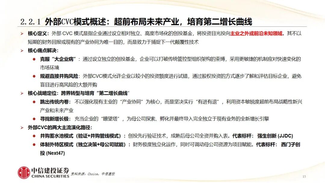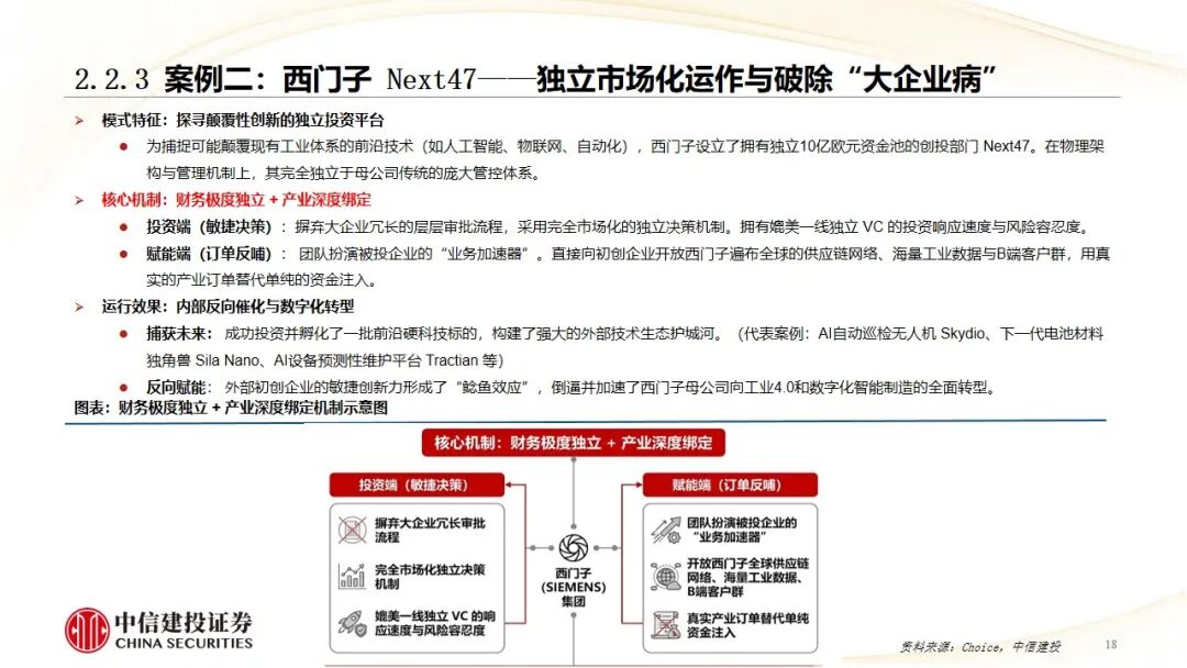 外部CVC模式(超前布局未来产业):以强生(JJDC) 的“合作-验证-收购”管线模式和西门子(Next47) 的独立市场化“体制外特区”模式为代表,核心是克服大企业病,跨界探索颠覆性技术,培育第二增长曲线