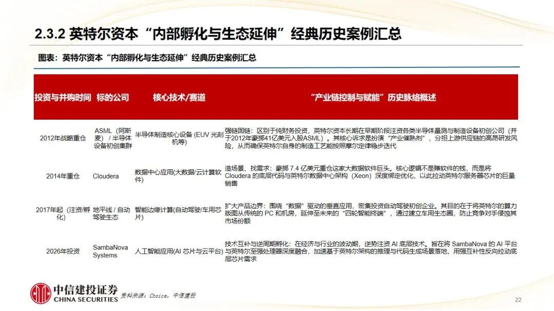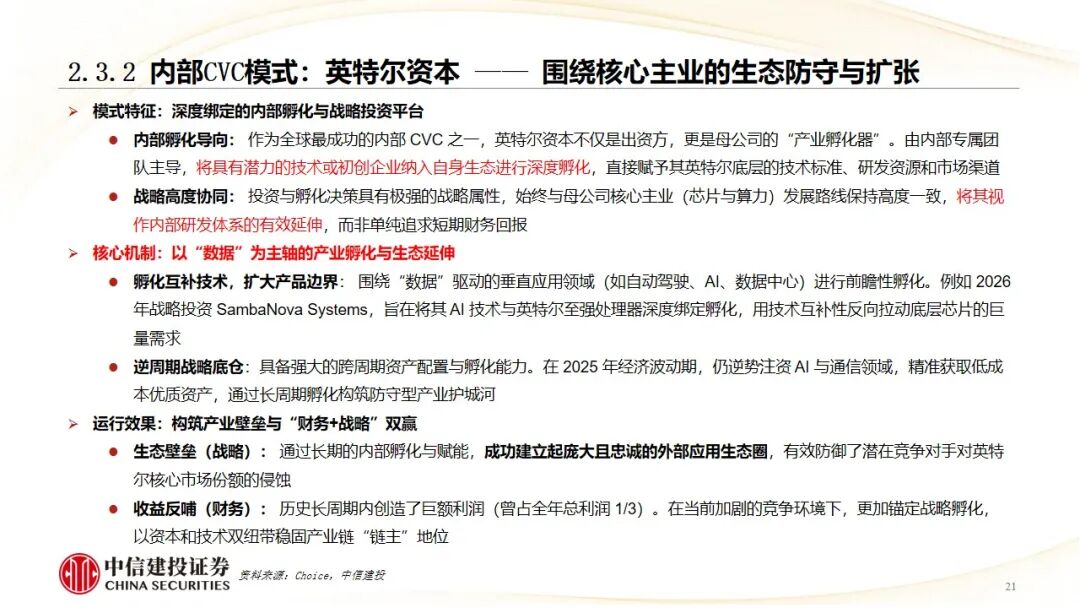 内部CVC模式(夯实产业协同生态):以英特尔资本为例,其投资严格围绕主业,通过“孵化互补技术、扩大产品边界”,旨在强化产业链控制力与生态协同,巩固核心优势