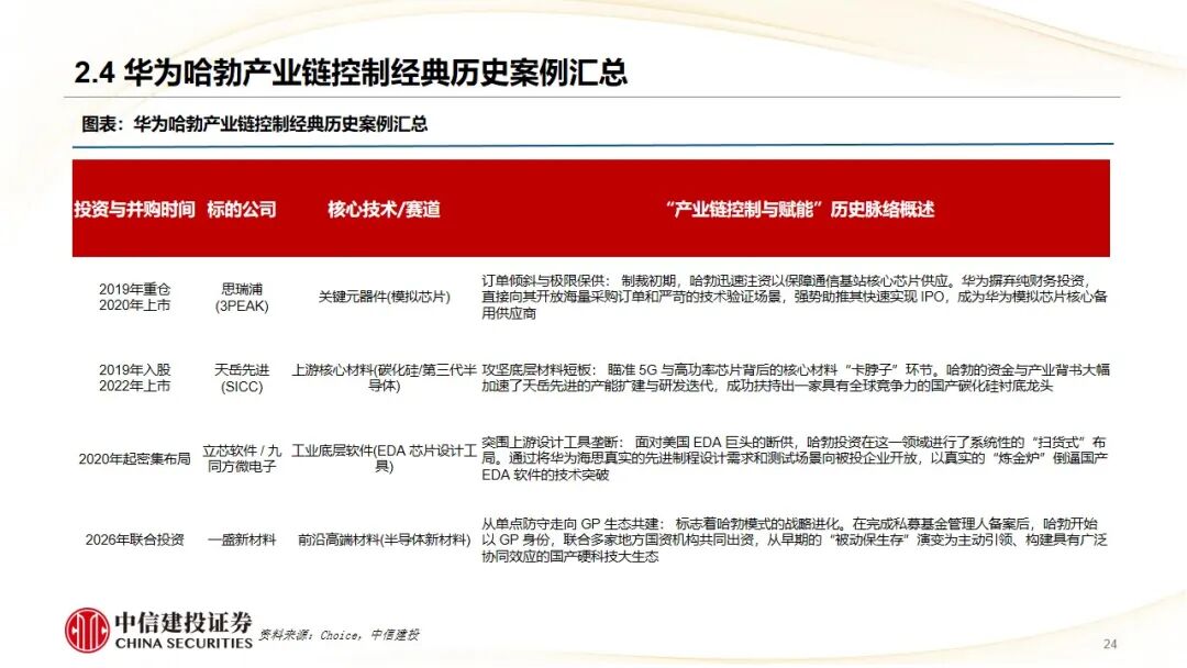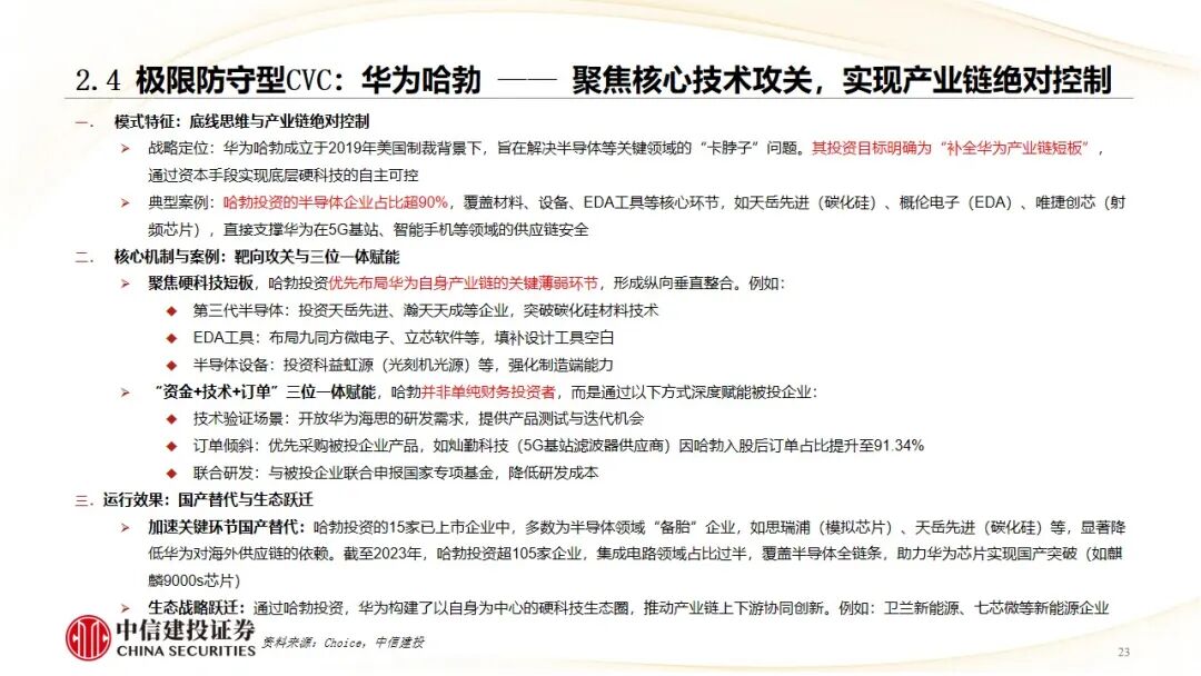 极限防守型CVC模式(实现产业链自主可控):以华为哈勃投资为典型,在特殊背景下诞生,以“补链、强链”为目标,通过“资金 技术 订单”三位一体赋能,解决关键领域“卡脖子”问题,实现产业链绝对控制