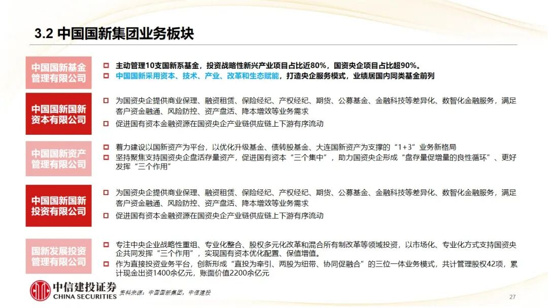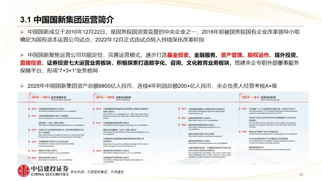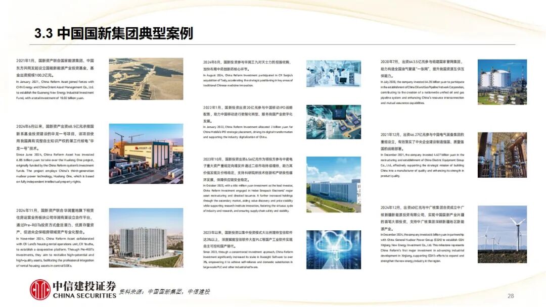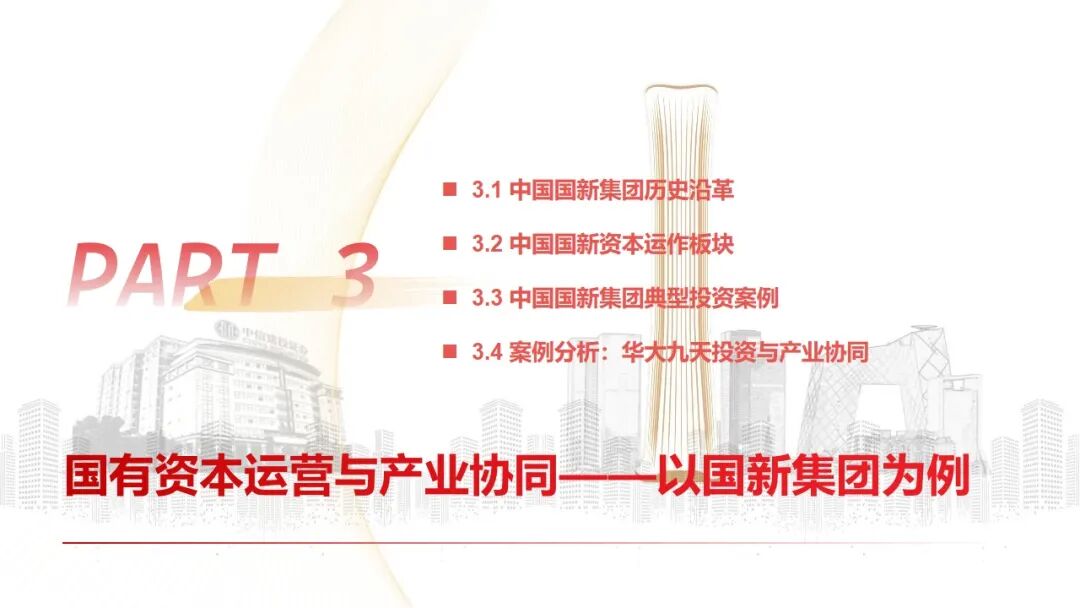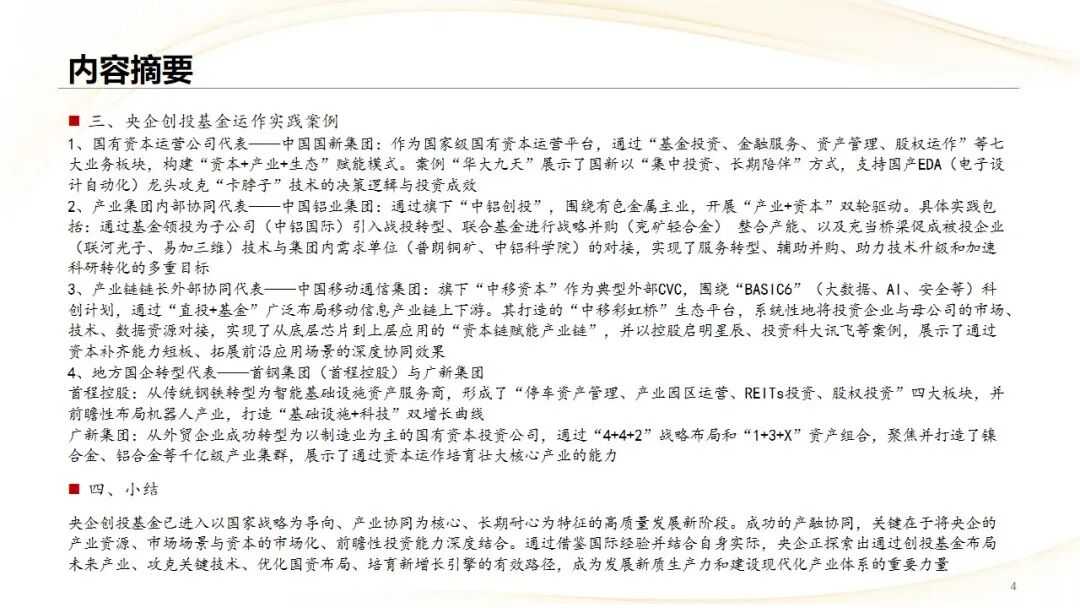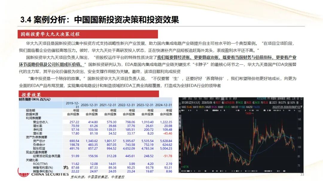1、国有资本运营公司代表——中国国新集团:作为国家级国有资本运营平台,通过“基金投资、金融服务、资产管理、股权运作”等七大业务板块,构建“资本 产业 生态”赋能模式。案例“华大九天”展示了国新以“集中投资、长期陪伴”方式,支持国产EDA(电子设计自动化)龙头攻克“卡脖子”技术的决策逻辑与投资成效