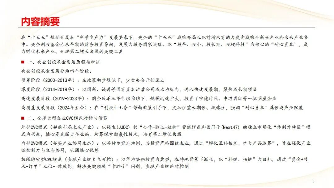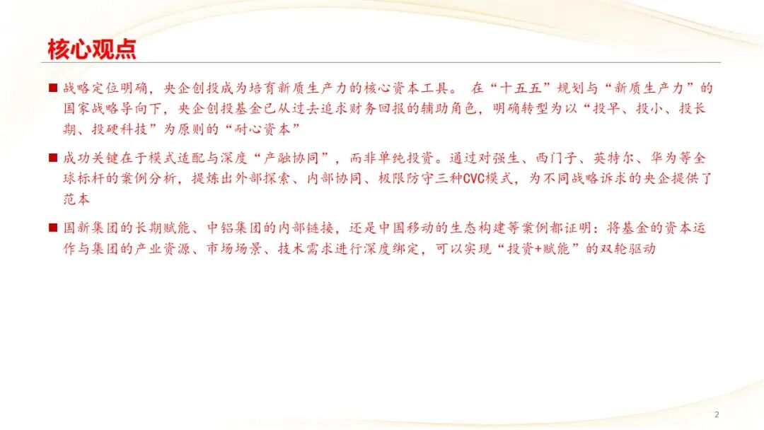 战略定位明确,央企创投成为培育新质生产力的核心资本工具。 在“十五五”规划与“新质生产力”的国家战略导向下,央企创投基金已从过去追求财务回报的辅助角色,明确转型为以“投早、投小、投长期、投硬科技”为原则的“耐心资本”