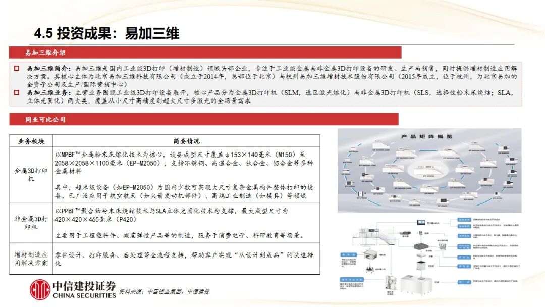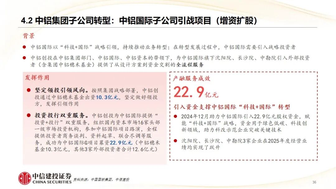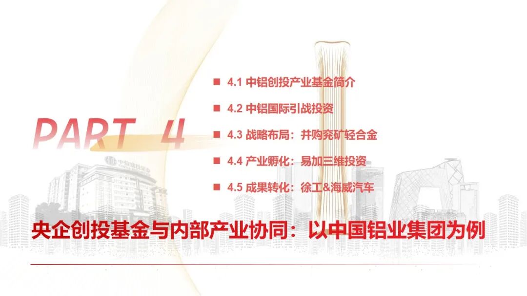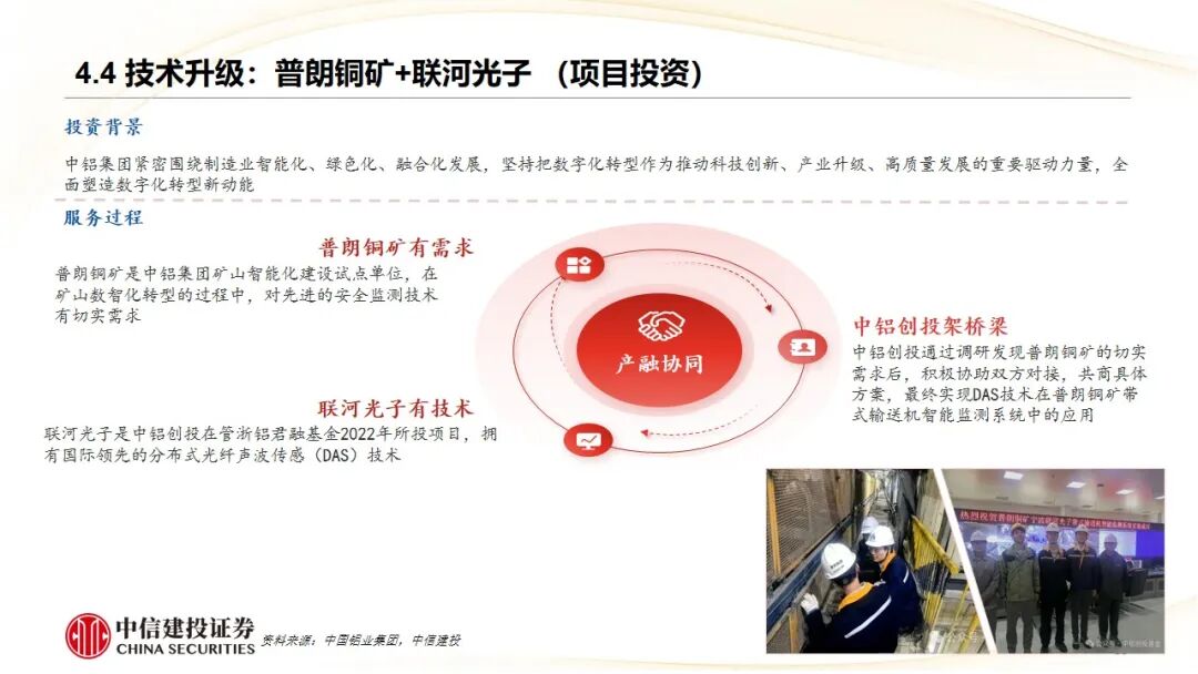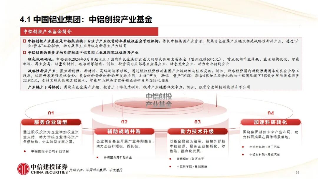 2、产业集团内部协同代表——中国铝业集团:通过旗下“中铝创投”,围绕有色金属主业,开展“产业 资本”双轮驱动。具体实践包括:通过基金领投为子公司(中铝国际)引入战投转型、联合基金进行战略并购(兖矿轻合金) 整合产能、以及充当桥梁促成被投企业(联河光子、易加三维)技术与集团内需求单位(普朗铜矿、中铝科学院)的对接,实现了服务转型、辅助并购、助力技术升级和加速科研转化的多重目标