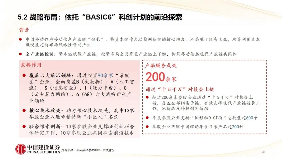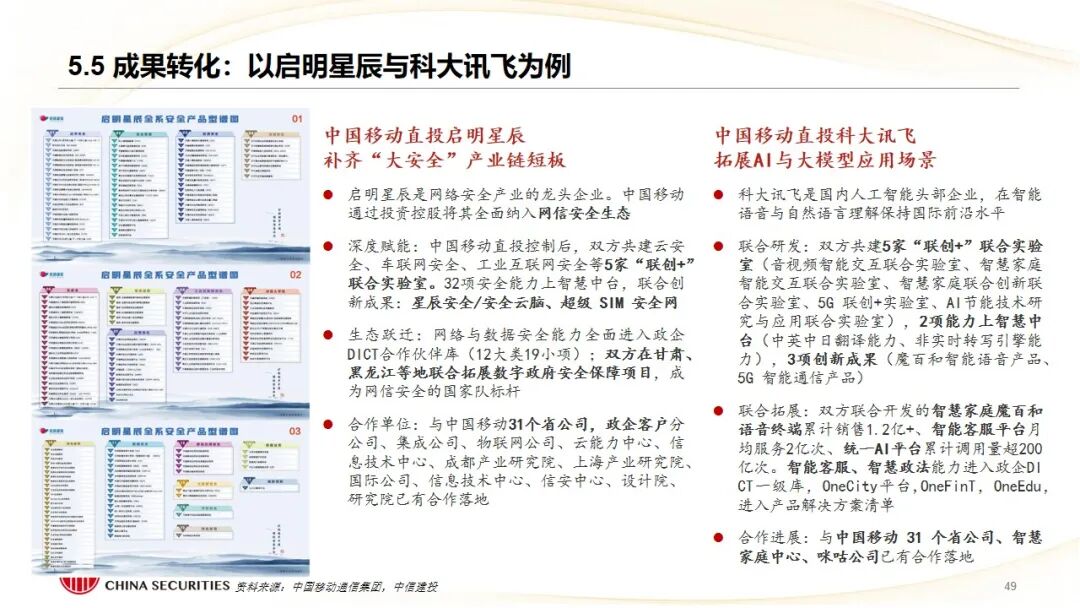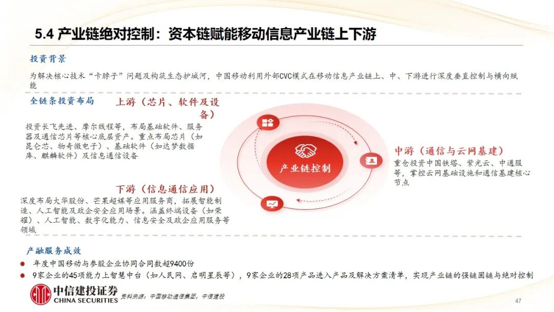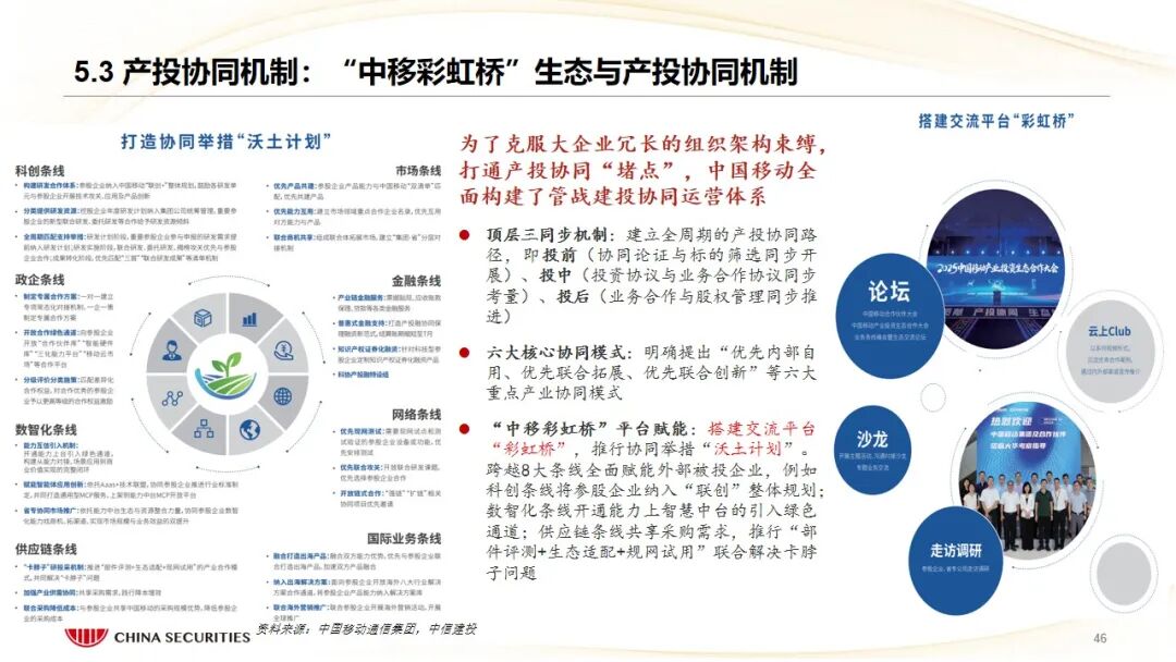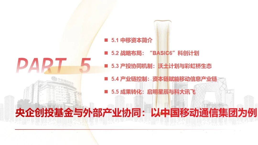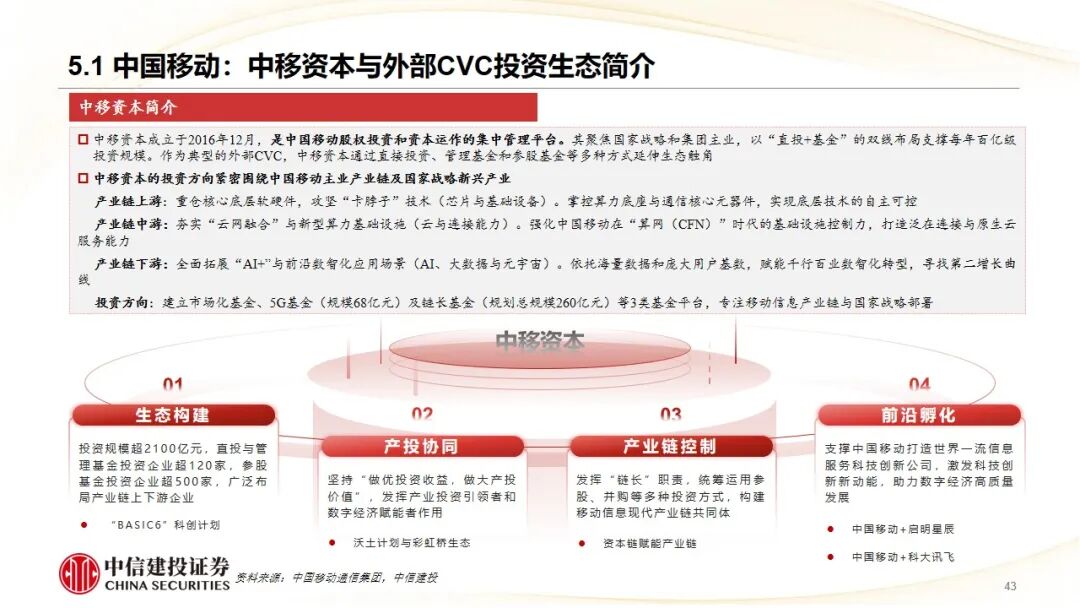3、产业链链长外部协同代表——中国移动通信集团:旗下“中移资本”作为典型外部CVC,围绕“BASIC6”(大数据、AI、安全等)科创计划,通过“直投 基金”广泛布局移动信息产业链上下游。其打造的“中移彩虹桥”生态平台,系统性地将投资企业与母公司的市场、技术、数据资源对接,实现了从底层芯片到上层应用的“资本链赋能产业链”,并以控股启明星辰、投资科大讯飞等案例,展示了通过资本补齐能力短板、拓展前沿应用场景的深度协同效果