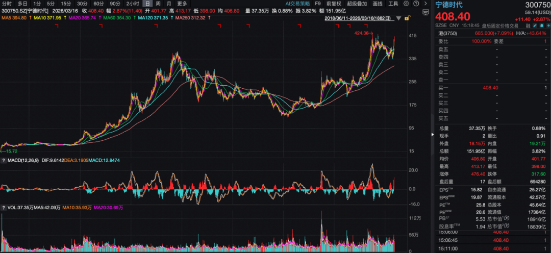 在披露年报的同时,“宁王”也发布了2025年利润分配预案,拟以4,531,886,650股为基数,向全体股东每10股派发现金分红69.57元(含税),合计分红约315.32亿元。事实上,过去三年,宁德时代已累计分红近千亿元。截至3月16日收盘,宁德时代报收于408.4元/股,动态PE为25.8倍,总市值为1.89万亿。