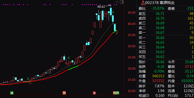 章源钨业作为国内钨产业链完整的龙头企业,覆盖采矿、冶炼及深加工全环节,拥有4座采矿权矿山,钨资源储量占全国约5.33%。2026年以来,该公司股价大幅上行,从最低约14.16元/股,涨至3月中旬最高48.42元/股,涨幅超过240%。