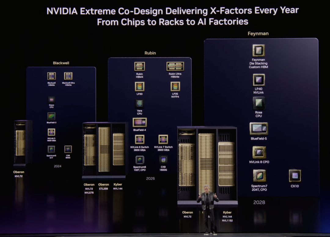 在发布会上,对于外界备受关注的下一代计算架构Feynman(费曼),老黄也做了预告,并表示计算架构,每年都会有新东西。