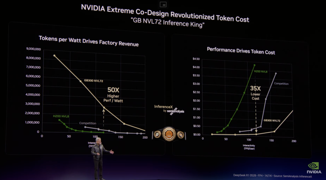 因为每座数据中心的功率都是物理约束,一座1GW的AI工厂永远不会变成2GW。在固定功率下,谁的每瓦token产出更高,谁的token成本就更低。