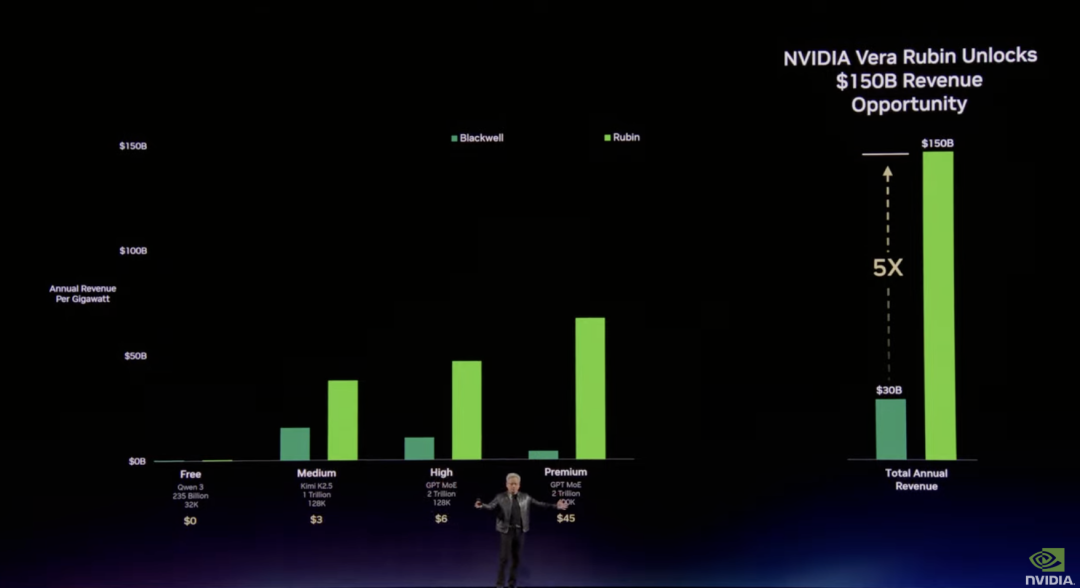 去年GTC上,我看到了5000亿美元的高确信需求。今年,站在同一个舞台上,这个数字变成了1万亿美元,覆盖Blackwell和Rubin到2027年的订单。
