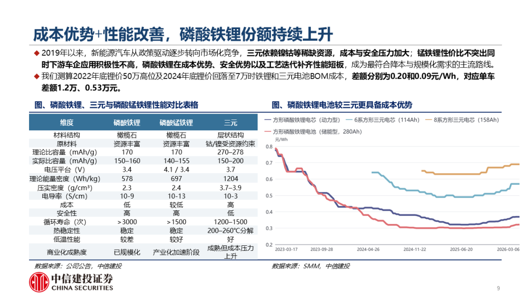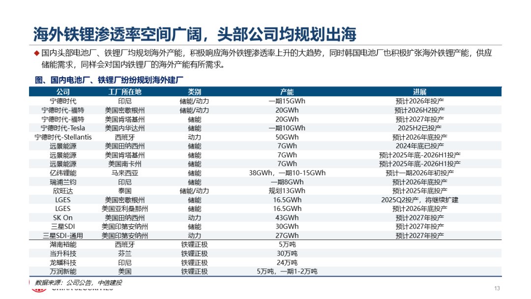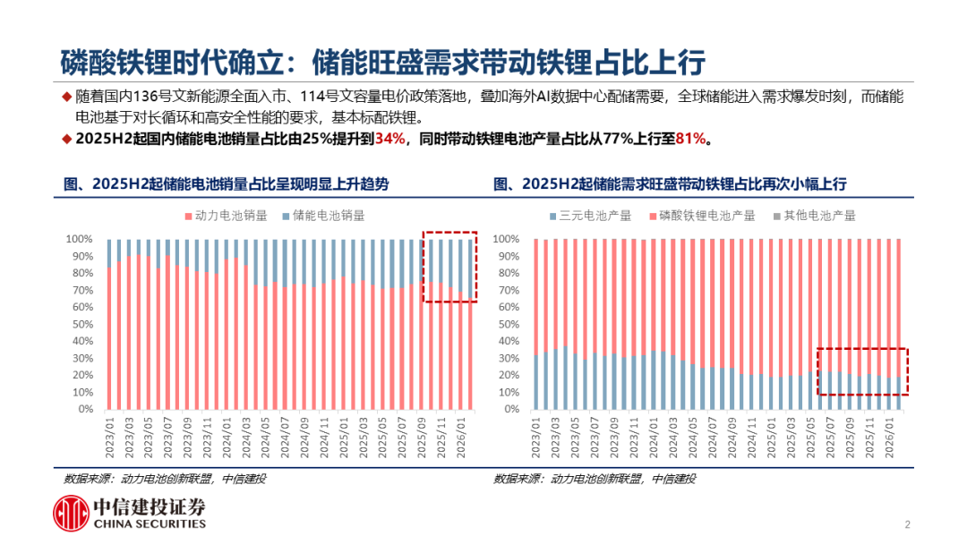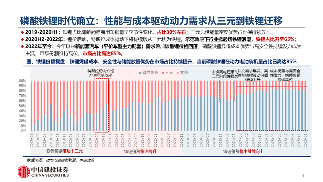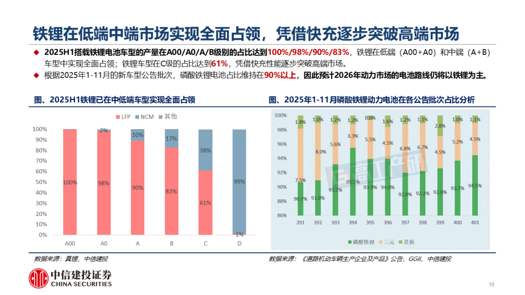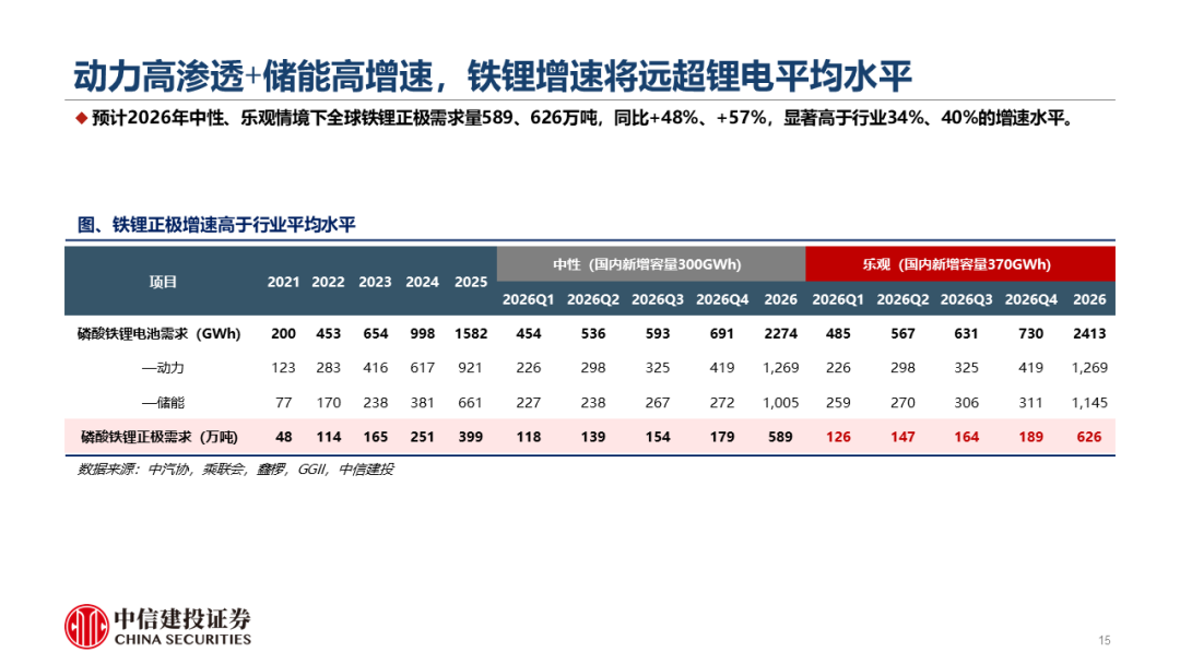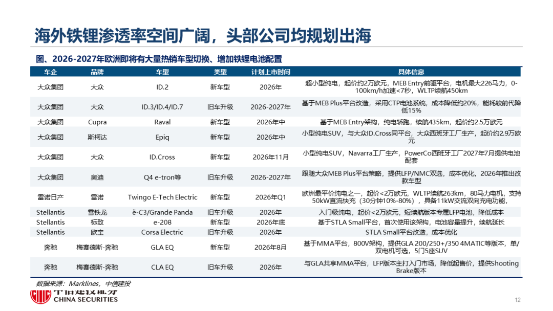 需求端:铁锂是锂电中游唯一具备【超额增速】的环节。储能方面,随着国内136号文、114号文落地,叠加海外AI数据中心配储需要,全球储能进入需求爆发时刻,而储能基于对长循环、高安全、高经济性的要求,基本标配铁锂。我们中性/乐观预计2026年全球储能电池需求1005/1145GWh,同比 52%/73%。动力方面,国内铁锂动力装机渗透率已达到85%,而2025年1-11月的新车型公告批次中铁锂电池占比维持在90%以上,因此预计2026年动力仍将以铁锂为主;欧洲铁锂渗透率12.8%仍处于较低状态,预计2026-2027年随着:1)中国车企出口欧洲销量增加;2)海外更多热销车型增加铁锂电池选项,预计2026-27年欧洲铁锂渗透率将提升至19.5%、31.2%,对应销量100、160万辆。预计2026年中性、乐观情境下全球铁锂正极需求589、626万吨,同比 48%、 57%,显著高于行业34%、40%的增速水平。