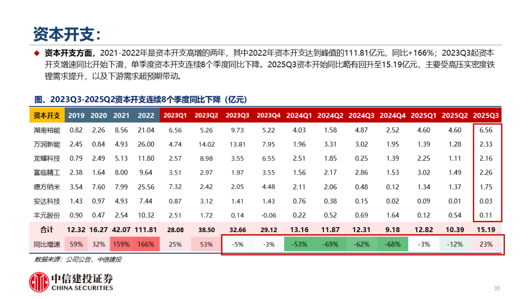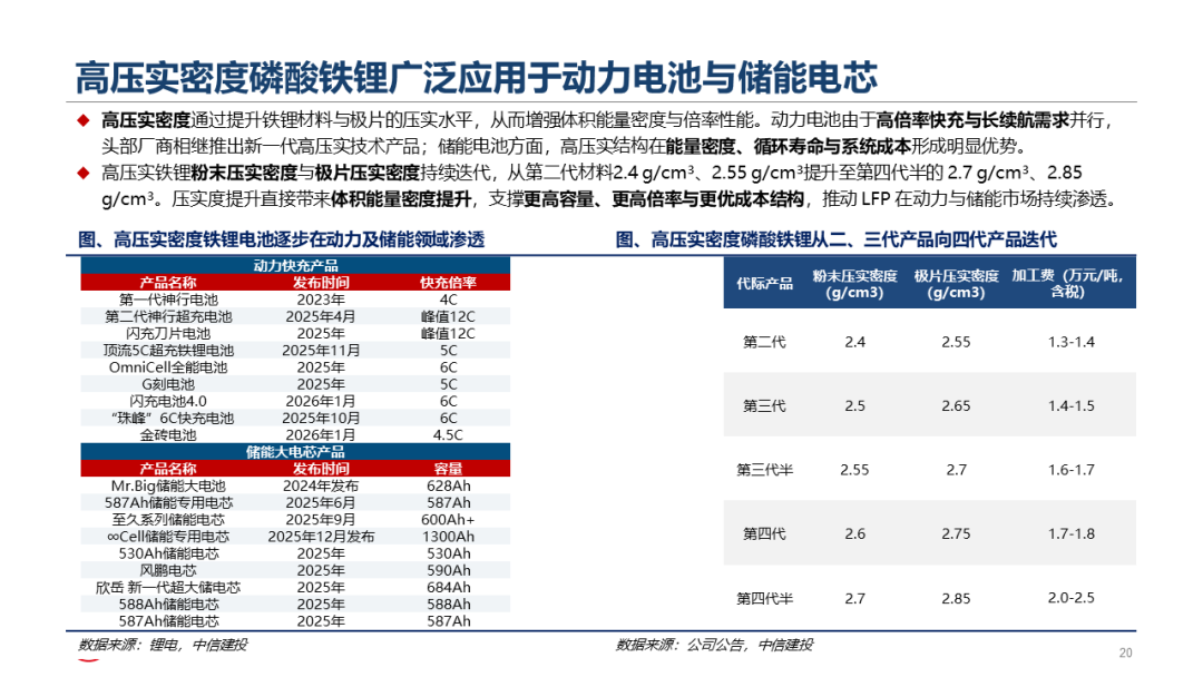 价格及利润端:涨价落地直接增厚铁锂利润,同时高压密占比提升带动结构优化。2025年11月铁锂协会率先发布成本价格指数,叠加铁锂企业连续3年亏损压力下的盈利诉求,推动铁锂正极落地1-2千元/吨涨价,成为中游涨价最快、覆盖面最广的环节。同时随动力快充和储能大电芯渗透率提升,高压密铁锂需求高增,预计2026年高压密铁锂需求169万吨,较普通铁锂溢价1-2千元/吨,进一步优化盈利。