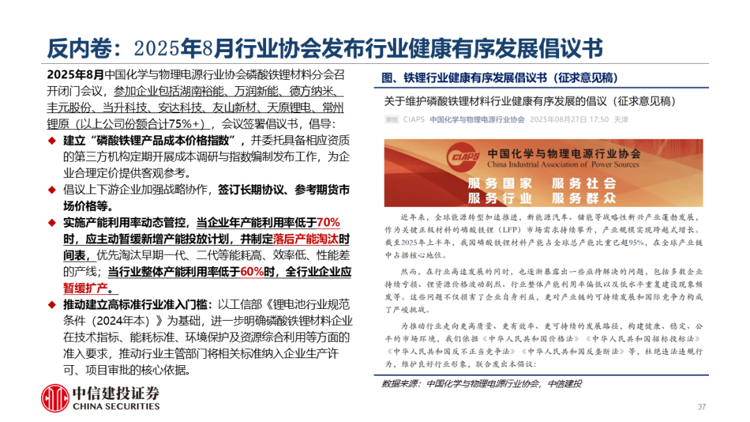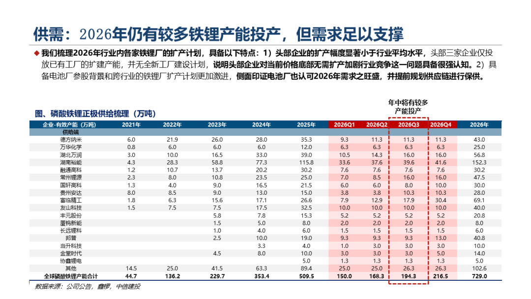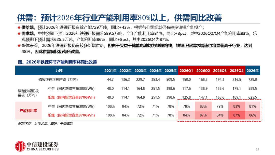 供给端:2026年仍有较多产能投产,但需求足以支撑。我们梳理2026年行业内各家铁锂厂的扩产计划,具备以下特点:1)头部企业仅针对已有工厂扩建产能,并无全新工厂建设计划,对当前价格底部无需扩产加剧行业竞争这一问题具备很强认知;2)具备电池厂参股背景和跨行业的铁锂厂扩产计划更加激进,但也侧面印证电池厂也认可明年需求之旺盛。我们预计2026年铁锂正极有效产能729万吨,同比 43%,中性/乐观预期下预计2026年铁锂正极需求589.5/625.5万吨,全年产能利用率81/86%,同比 3/8pct,供需同比仍有所改善。