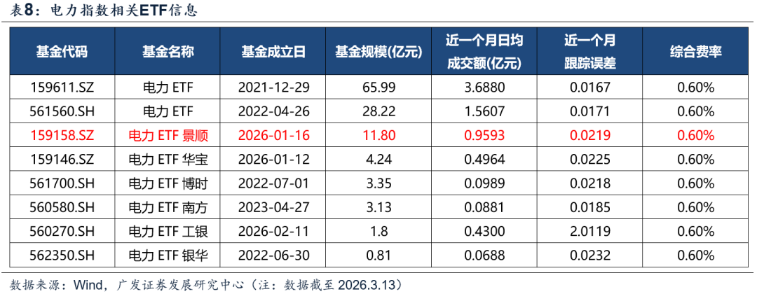 当前跟踪电力指数的ETF共8只,相较于同类型产品,电力ETF景顺具备以下优势:①流动性良好,跟踪误差小:截至2026年3月13日,电力ETF景顺近一个月日均成交额为0.96亿元,具备较好的交易活跃度;同时近一个月跟踪误差为0.0219,在同类产品中处于合理区间,能够较好实现对标的指数的跟踪;②新成立产品中规模基础较为突出:电力ETF景顺成立于2026年1月,目前基金规模为11.80亿元,在同期成立的电力指数ETF中处于较高水平,显示出较强的资金关注度与产品吸引力。