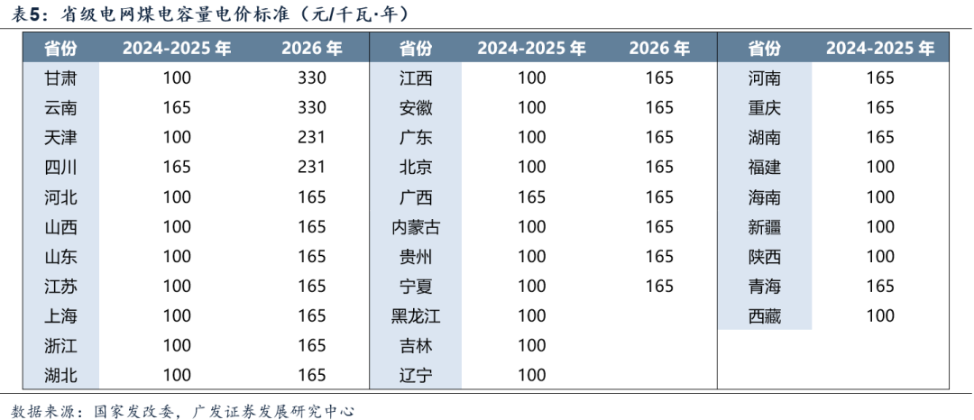 容量电价进一步提升,火电度电收入中稳定电价部分的比例继续提高。2024-2025年,省级电网中河南、湖南、重庆、四川、青海、云南、广西等七个省份煤电机组固定成本回收比例是50%,对应容量电价165元/千瓦·年;其余省份成本回收比例为30%,对应容量电价100元/千瓦·年,《关于完善发电侧容量电价机制的通知》出台后,各省煤电容量电价标准将至少提升至165元/千瓦·年,目前多数省份已出台2026年的标准,其中甘肃、云南将容量电价提升至330元/千瓦·年,天津、四川提升至231元/千瓦·年,其他省份也提升至165元/千瓦·年,容量电价预期仍有提升空间,火电度电收入中的稳定部分比例持续扩大。