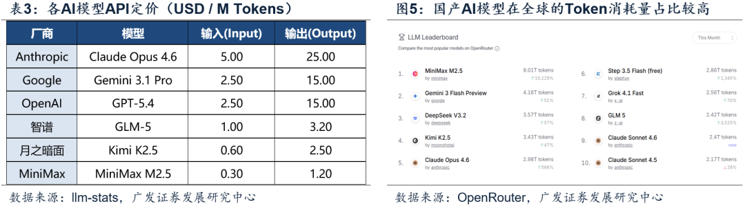 与此同时,国产大模型在API价格方面具备明显成本优势。以主流模型API定价为例,国产模型在输入与输出Token价格上普遍显著低于海外头部模型,这使得其在全球开发者与企业客户中的使用门槛更低,有助于进一步扩大调用规模。在成本优势与模型能力持续提升的共同作用下,国产模型的Token调用量有望继续提升,从而推动全球AI算力需求进一步增长。