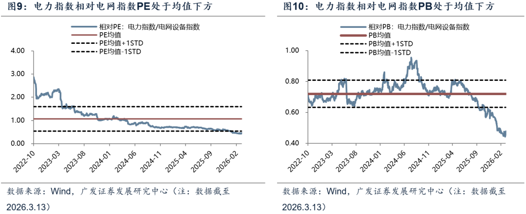 1. 估值角度:电力相对电网设备的估值处于历史低位