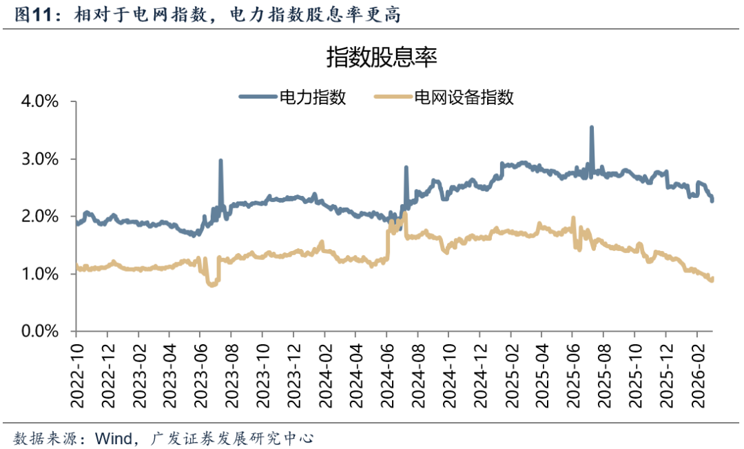 除了估值层面的折价外,电力资产在现金回报方面也具备明显优势。作为典型的公用事业行业,电力企业通常拥有稳定的现金流与较高的分红比例,因此电力板块整体具备较强的股息属性。指数层面来看,电力指数的股息率整体明显高于电网设备指数,反映出电力运营资产在现金回报方面具有更强优势。