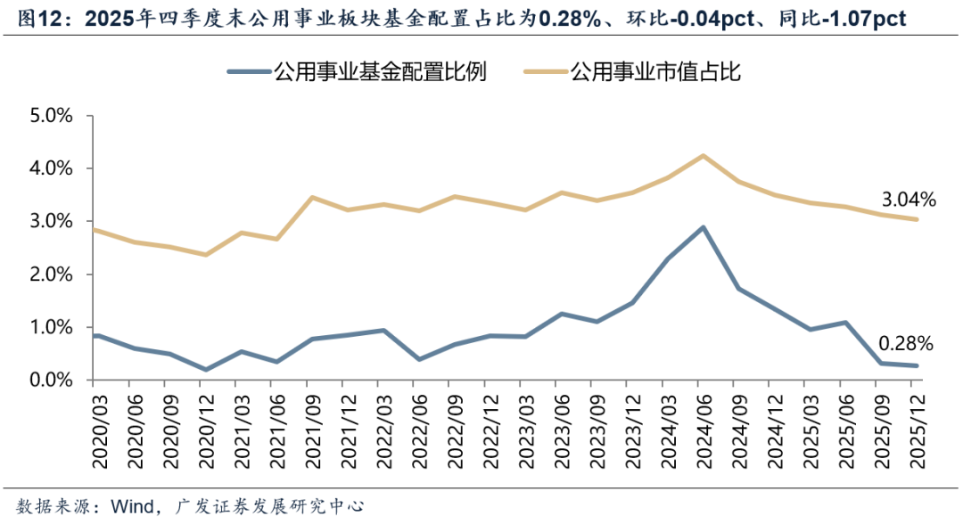 2025年四季度纯电板块基金持仓降至低点,低配下极具反转弹性与配置价值。受市场风格切换影响,公募基金对公用事业及电力子板块的配置比例持续回落。截至2025年四季度末,公募基金公用事业持仓占比降至0.28%的近五年次低位,远低于板块3.04%的市值占比。进一步拆分纯电细分板块来看,火力发电、水力发电的配置比例分别仅为0.091%、0.096%,而核电与绿电的配置比例更是极度低配至0.001%和0.000%。火电近两个季度的配置比例已创下2022年以来新低,各大纯电板块均处于筹码极其出清的真空状态。当前板块已开始企稳,伴随增量资金的配置需求提升,这种极致的底部筹码结构为电力板块塑造了极大的估值反转空间,板块攻防兼备。