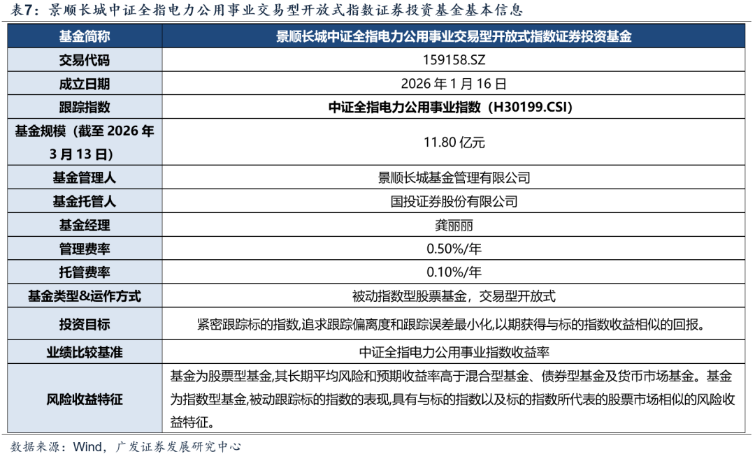 景顺长城中证全指电力公用事业交易型开放式指数证券投资基金(交易代码:159158.SZ)是景顺长城基金管理有限公司旗下跟踪中证全指电力公用事业指数的ETF产品,于2026年1月16日成立,根据Wind数据,截止2026年3月13日,该基金规模达到11.80亿元。