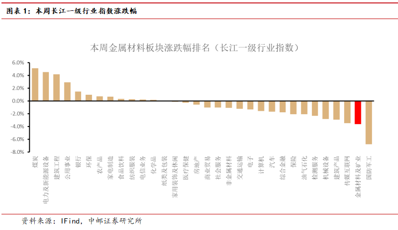 根据长江一级行业划分,有色金属行业本周跌幅为-3.6%,排名第31。