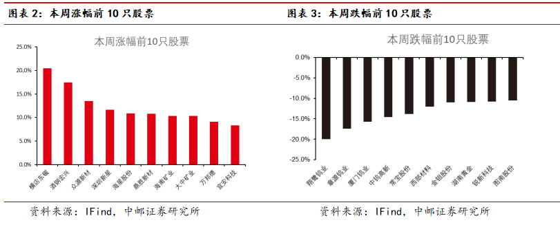 本周有色板块涨幅排名前5的是横店东磁、酒钢宏兴、众源新材、深圳新星、海星股份;跌幅排名前5的是翔鹭钨业、章源钨业、厦门钨业、中钨高新、常宝股份。