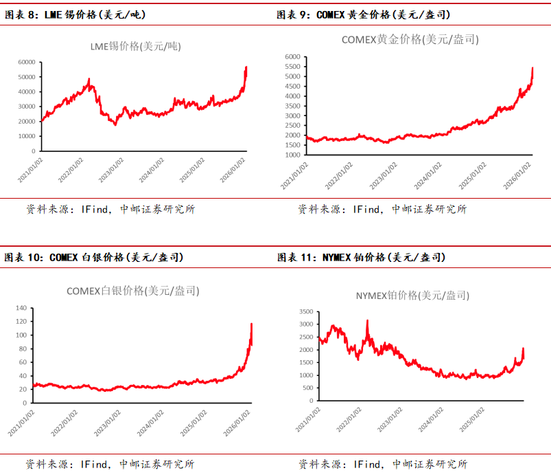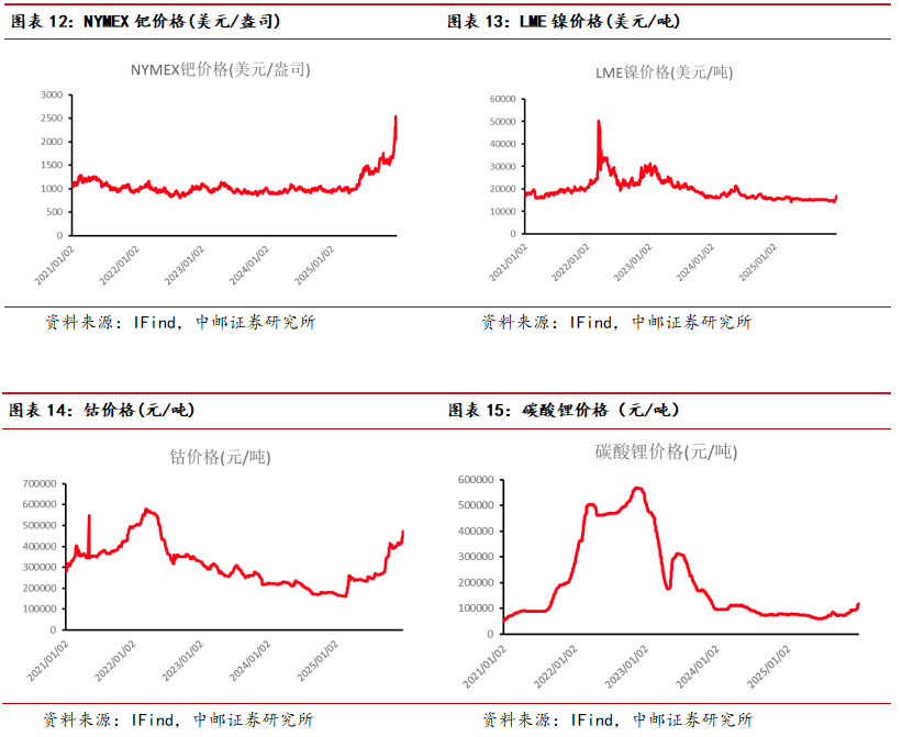 锂:能源安全考虑支撑锂价中长期走势。本周锂价上涨,下游询价积极但采购谨慎,实际成交不足,市场延续僵持。需求端游企业普遍维持去库操作,采购意愿明显增强,其中储能领域需求增速尤为突出,新增项目开工及配套需求持续释放,成为拉动整体需求增长的核心动力。我们认为基于能源安全考虑,海外储能项目或加速建设,储能需求的景气度有望超预期,支撑锂价中枢上移。