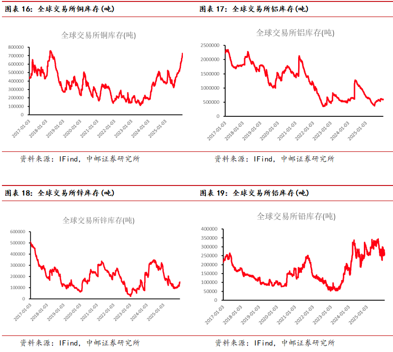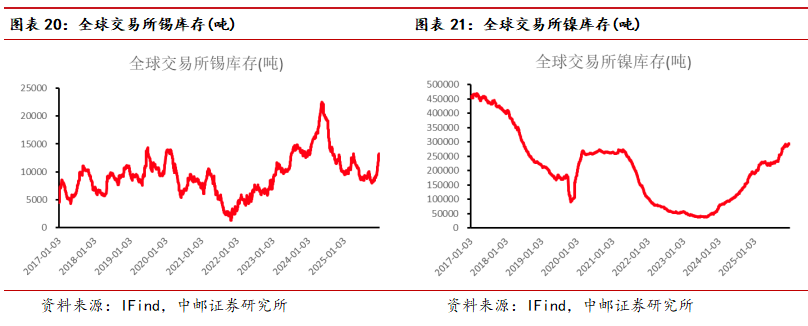 基本金属方面:本周全球显性库存铜累库8758吨、铝累库16815吨、锌累库12844吨、铅累库10918吨、锡累库2899吨、镍去库195吨。