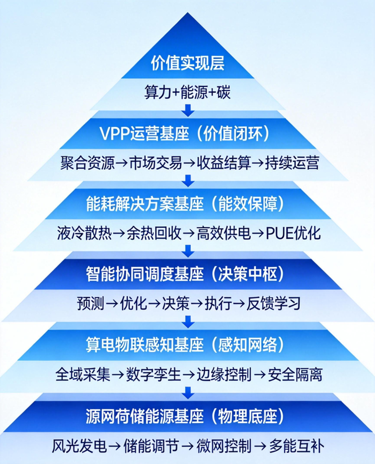 虚拟电厂(VPP)基座是算电协同的价值实现层,通过聚合分布式能源、储能、可调负荷等资源,参与电力市场交易,获取额外收益,形成可持续的运营模式。这不仅补充了数据中心的绿电来源,还可能带来电力交易的增量收益,实现算力、能源、碳价值的有机统一。