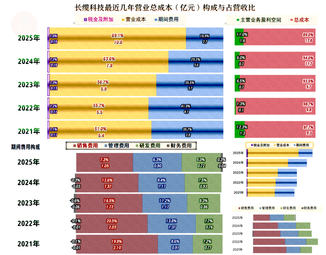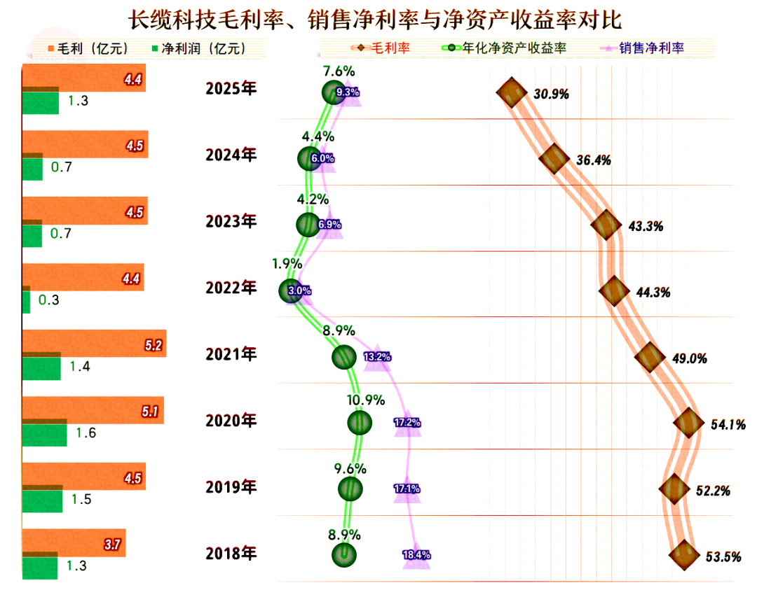按年度来看,2025年的毛利率持续快速下跌,这已经是连续五年下跌了,较下跌前的2020年,累计跌去了13.2个百分点。对任何一家公司来说,这样的持续下跌都是难以承受的,好在长缆科技除了2022年之外,营收增长抵消掉了部分毛利率下跌的影响。当然,影响还是有的,那就是2025年的净利润无法和营收一并创下新高。