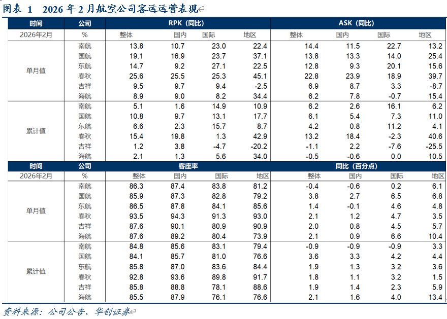 2月:ASK同比:南航(22.7%) > 东航(20.1%) > 春秋(18.9%) > 国航(14.0%) > 吉祥(3.3%) > 海航(-0.7%),RPK同比:东航(27.1%) > 春秋(25.3%) > 国航(23.7%) > 南航(23.0%) > 吉祥(9.4%) > 海航(8.2%);
