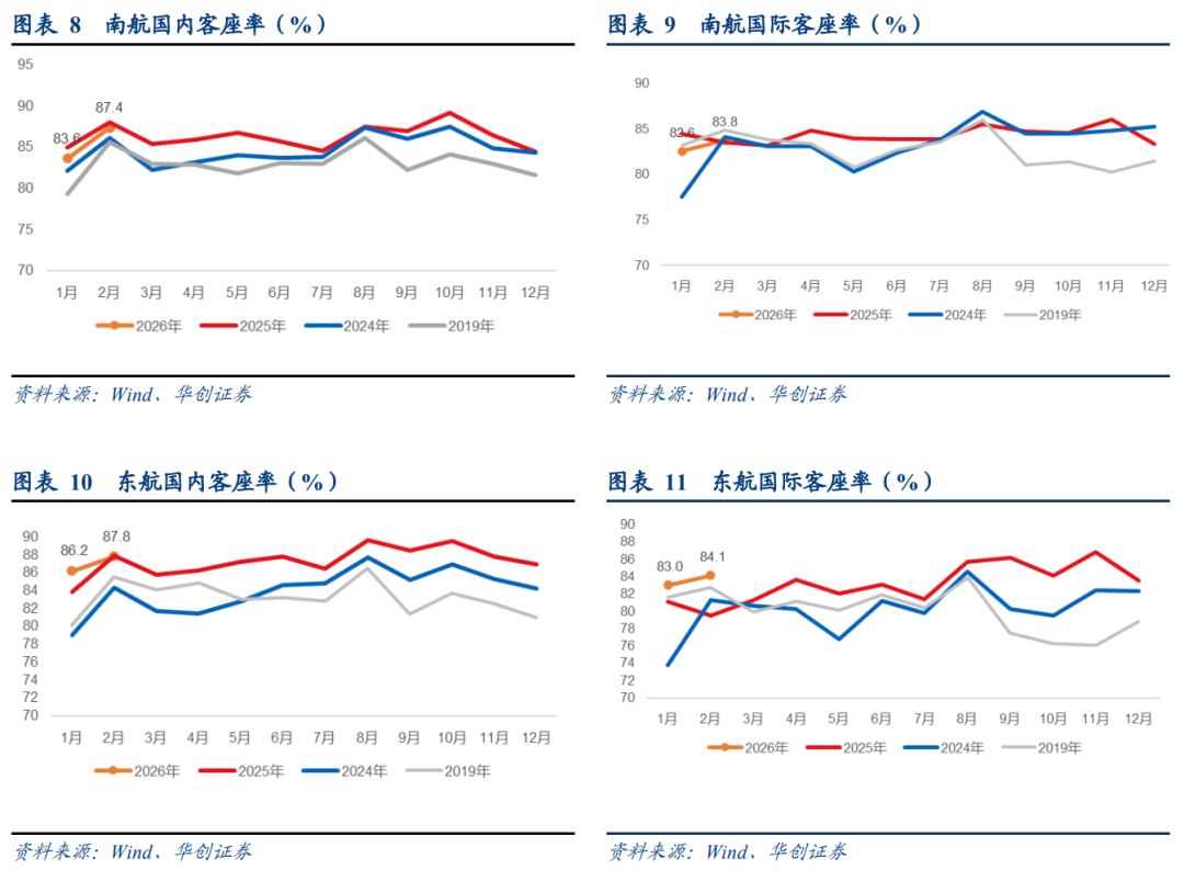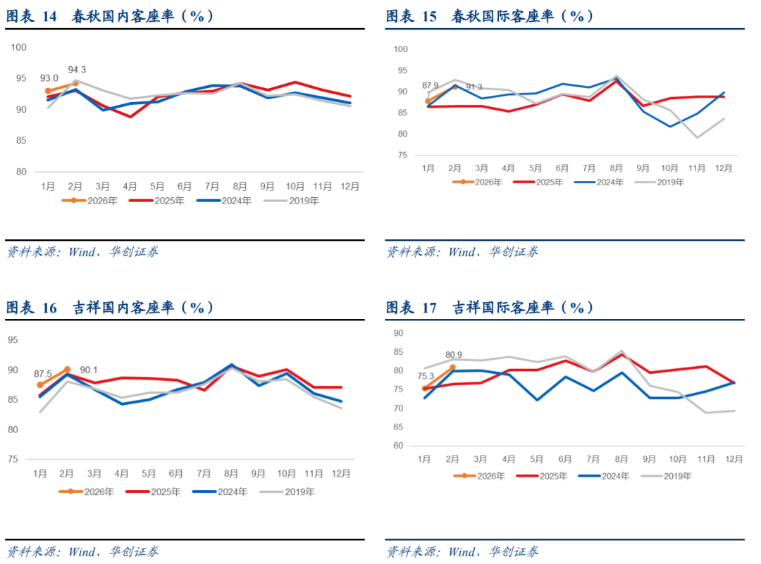 1~2月:春秋(92.8%,同比 1.8%) > 东航(85.8%,同比 1.9%) > 吉祥(85.8%,同比 1.9%) > 海航(85.5%,同比 2.1%) > 南航(84.8%,同比-0.9%) > 国航(84.1%,同比 3.6%)。