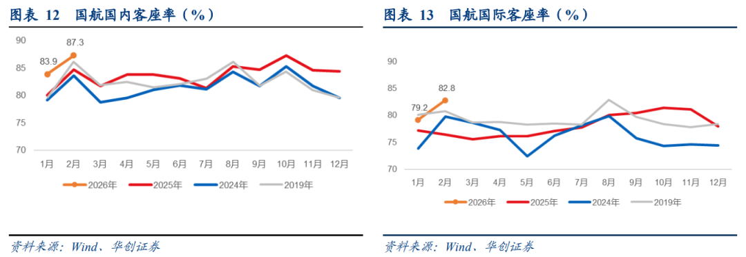 1~2月累计:ASK同比:南航(16.1%) > 东航(11.2%) > 国航(7.3%) > 海航(0.03%) > 春秋(-2.3%) > 吉祥(-7.6%),RPK同比:东航(15.7%) > 南航(14.9%) > 国航(13.1%) > 海航(5.6%) > 春秋(1.3%) > 吉祥(-4.7%)。