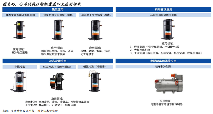 公司是国内涡旋压缩机龙头,出货量内资品牌第一。公司成立于2011年,主要产品为涡旋压缩机,涵盖热泵、商用空调、冷冻冷藏、电驱动车用四大系列。根据公司招股说明书,公司于13年实现涡旋压缩机批量生产,是国内第一家实现量产的涡旋压缩机企业,成功打破外资垄断。截至22年底公司累计实现涡旋压缩机出货量112万台,出货量为内资品牌第一。22年公司涡旋压缩机国内市占率为5.59%,仅次于五大外资品牌,位居国内第六。