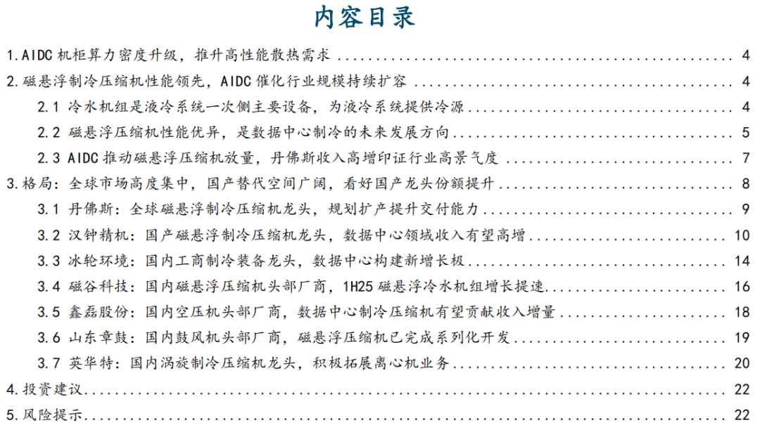 近年来,全球AIDC扩张叠加机柜功率密度提升,催化数据中心散热需求上行。磁悬浮离心制冷压缩机组性能优越,电机功耗低、运行成本低,可帮助数据中心将PUE降低至1.2。未来伴随着全球AI算力投资的持续提升,磁悬浮压缩机市场规模有望持续扩容,建议关注国内磁悬浮制冷压缩机头部厂商。