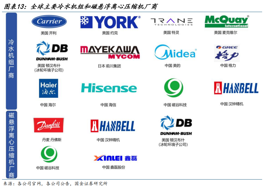 丹佛斯为全球磁悬浮压缩机龙头,市场份额约70%;国内企业中,汉钟精机等国产厂商通过持续的高研发投入,已实现核心技术突破,未来有望凭借成本优势、大客户深度绑定和新客户持续突破不断推动国产化进程,以及实现全球份额提升。