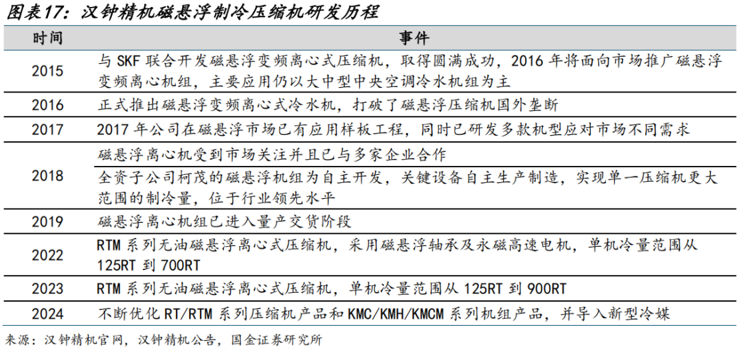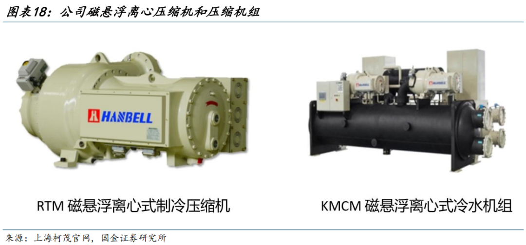 公司离心压缩机业务主要通过子公司上海柯茂开展。上海柯茂成立于2009年,为汉钟精机全资子公司,专业从事离心压缩机研发制造,产品包括传统有油离心式压缩机、磁悬浮无油离心式压缩机、离心式冷水、水源热泵、磁悬浮机组等产品。