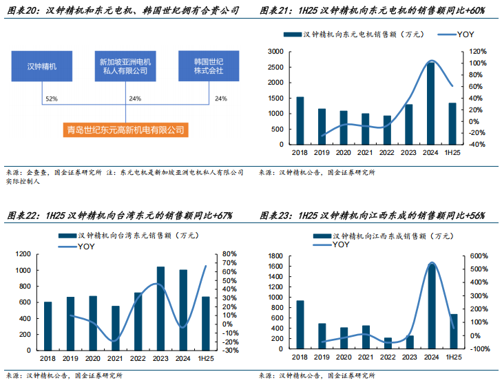 东元电机是公司制冷压缩机产品领域的客户,公司与其长期深度合作,并拥有合资公司青岛世纪东元。青岛世纪东元成立于2008年,汉钟精机、新加坡亚洲电机私人有限公司(东元电机是其实控人)、韩国世纪分别持股52%/24%/24%。公司向东元电机销售制冷压缩机,主要分为两部分,一是销售到台湾东元,另一个是销售到江西东成(东元电机在大陆的子公司)。当前,东元电机发力数据中心业务,有望带动公司数据中心用的制冷压缩机收入规模提升。1H25公司向东元电机关联交易金额1338万元,同比 60%。