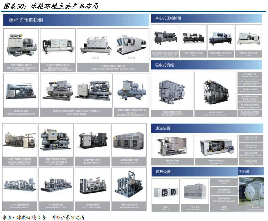 公司是我国工商制冷装备行业龙头,产品下游应用广泛。公司是我国工商制冷设备龙头,主要产品包括螺杆式压缩机、离心式压缩机、吸收式制冷机、活塞式压缩机、涡旋式压缩机、工业热泵、储能蓄能装置、真空冻干设备等。产品广泛应用于食品冷冻冷藏、冷链物流基地建设等商业制冷系统;能源化工生产工艺冷却、建筑骨料冷却等工业冷冻系统;轨道交通、商业地产等商用舒适空调;以及数据中心、核电站、冶金石化、电子厂房等工业特种空调等领域。