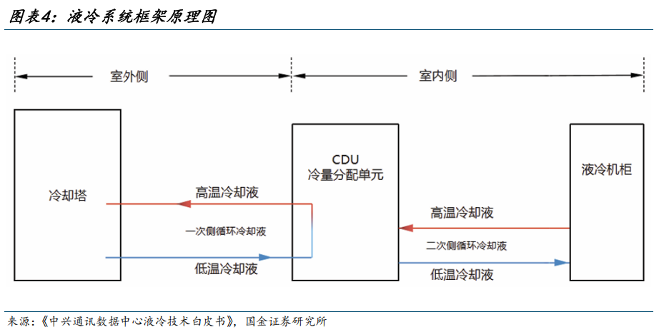 冷水机组是制冷系统主要设备。例如,以液冷系统为例,液冷系统通常采用一次侧(室外)、二次侧(室内)和液冷分配单元(CDU)的架构,以实现冷媒与IT设备的隔离,保障系统安全。