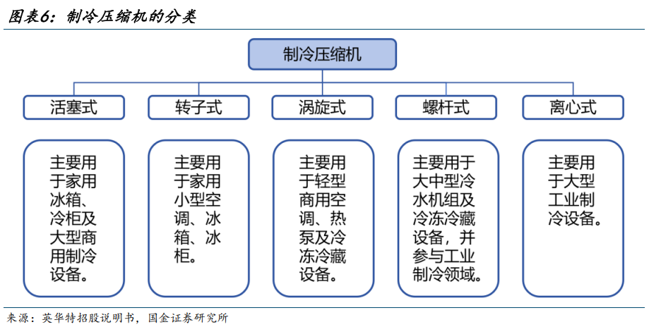 按制冷量差异,制冷压缩机主要分为家用(5HP及以下)、轻型商用(5-40HP)、大中型商用(40HP-150HP)、特大型商用及工业制冷(150HP-300HP)四大类。目前基本形成了“家用低功率场景转子式、活塞式为主,轻商场景涡旋式为主,大中型商业领域涡旋式、螺杆式差异化竞争,特大型商业和工业场景离心式为主”的市场格局。