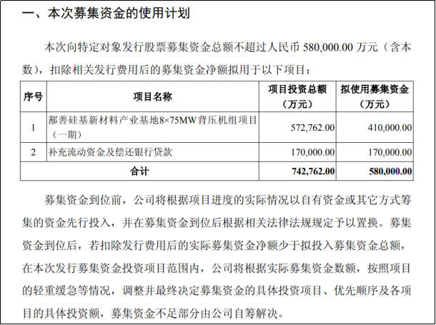 3月6日,合盛硅业(SH:603260)发布定增募资公告,拟向不超过35名特定投资者非公开发行不超过3.55亿股A股股票,募集资金总额不超过58亿元。其中41亿用于鄯善硅基新材料产业基地8×75MW背压机组项目(一期)(以下简称“背压机组项目”),其余17亿用于补充流动资金及偿还银行贷款。