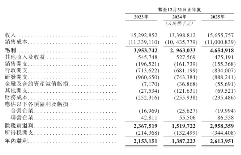 招股书显示,于2023年度、2024年度、2025年度,璞泰来实现收入分别约152.93亿元、133.99亿元、156.56亿元;录得年内溢利分别约21.53亿元、13.87亿元、26.14亿元;毛利率分别约为25.9%、22.1%、29.7%。