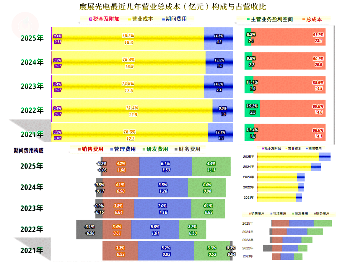 2025年的主营业务盈利空间有所下降,这已经是比前四年都低的水平了。除了毛利率下滑的影响之外,期间费用占营收比上升的影响更大。