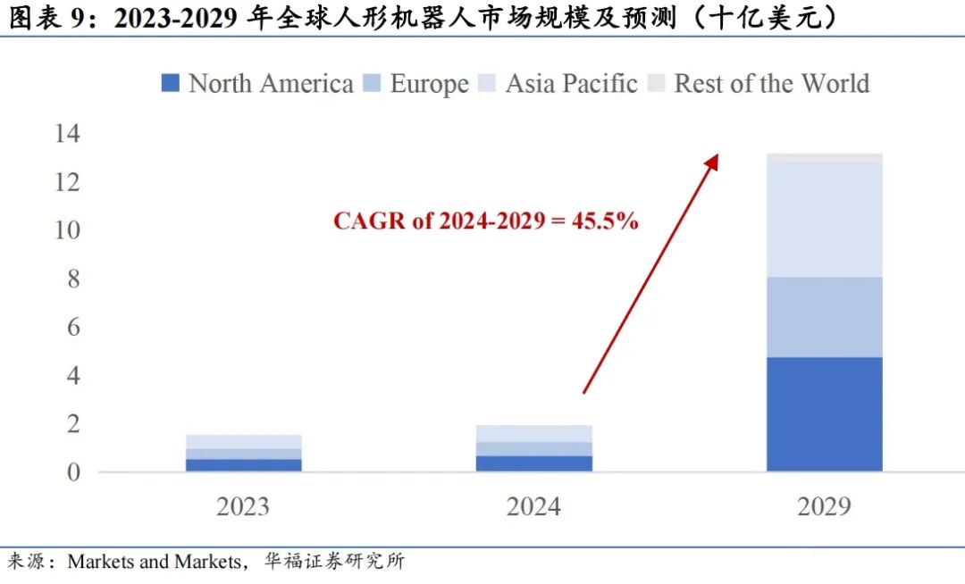 目前,全球人形机器人产业正经历从技术研发到规模化商用的关键转折。据Markets and Markets数据,全球人形机器人市场预计将从2024年的20.3亿美元增长到2029年的132.5亿美元,复合年增长率为45.5%。而中国厂商凭借成本控制与场景落地能力,正在构建全球竞争壁垒。据《人形机器人产业研究报告》,2024年中国人形机器人市场规模将达到27.6亿元;到2029年,该市场规模有望扩大至750亿元;到2035年这一市场规模有望进一步提升至3000亿元,2025-2035年复合增速达53.15%。