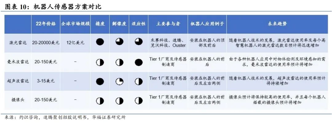 国内人形机器人采用深度相机 激光雷达混合传感器作为视觉方案。机器人感知的主要传感器包括激光雷达、摄像头、超声波雷达及毫米波雷达。随著未来机器人智慧化的预期进步以及对环境感知需求的不断增长,预计多种类型传感器进一步整合。激光雷达是人形机器人实现环境感知与自主决策的核心传感器,是机器人的三维空间建模与避障、动态目标追踪与交互、抗干扰等刚性需求上的必备硬件。例如宇树科技H1机器人,头部搭载了速腾聚创自主研发的激光雷达Helios,同时宇树科技的人形智能体“Unitree G1”、机器狗“Go2”均标配激光雷达。