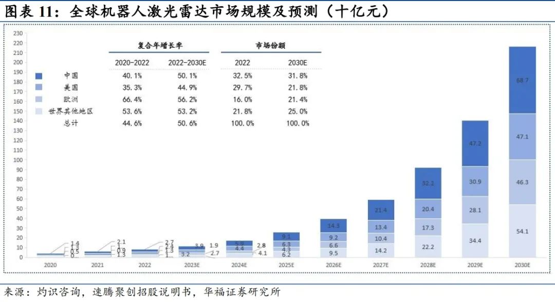 展望未来,为提高机器人感知的稳健性及准确性,机器人需要配备更多传感器以全面感知其周边环境。因此,配备多个激光雷达的人形机器人已成为趋势。受机器人数量增加、机器人激光雷达采用率提高及单台机器人配置量共同推进,预期机器人激光雷达解决方案市场将呈现指数式增长。根据灼识询报告,机器人激光雷达解决方案市场预计将以50.6%的复合年增长率从2022年的82亿元大幅增长到2030年的2162亿元。中国预期于2030年成为全球最大的市场,约全球市场的31.8%。