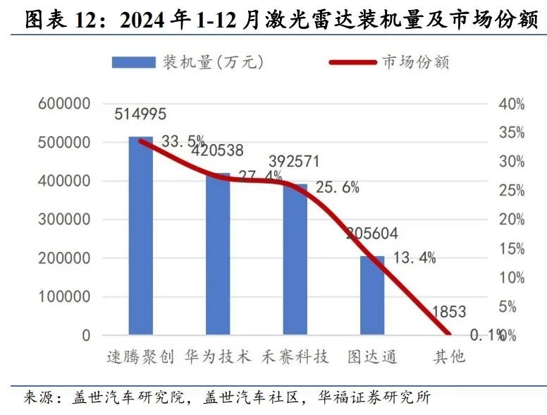 在国内市场,汽车激光雷达市场集中度提升,头部效应强化。激光雷达行业巨头企业通过技术突破、规模化生产和资源整合占据优势地位,形成高效的市场整合效应,为其高速发展奠定了稳定基础。目前速腾、禾赛、华为、图达通占据垄断地位,2024年,激光雷达行业集中度进一步提高,前四大厂商的市场份额从2022年的86%上升至近100%。市场结构高度集中化带来的整合效应将极大地促进整体行业创新效率的提升,推动技术的持续发展与成熟,激光雷达技术成本将进一步降低,其覆盖范围有望加速拓展。
