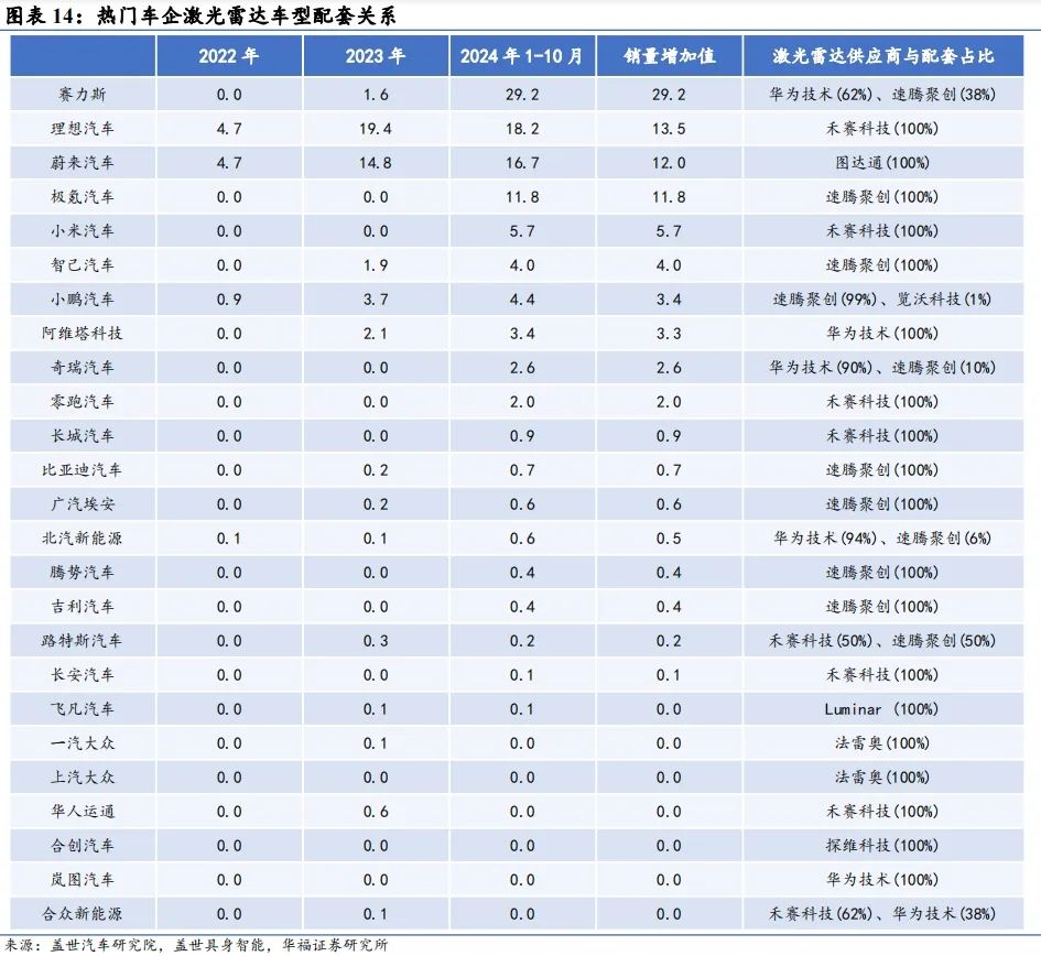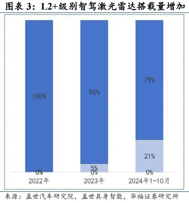另一方面,激光雷达配置往低等级自动驾驶车型下沉中。在2022年,激光雷达主要搭载在L2 级别智驾系统;2023年,激光雷达开始陆续装配在L2 智驾级别系统中;到2024年 1-10月,L2 级别车型中搭载激光雷达的比例达到21%,代表车型有智己L6、极氪001、路特斯繁花等。激光雷达配置往低等级自动驾驶车型的下沉也将加速激光雷达的渗透。